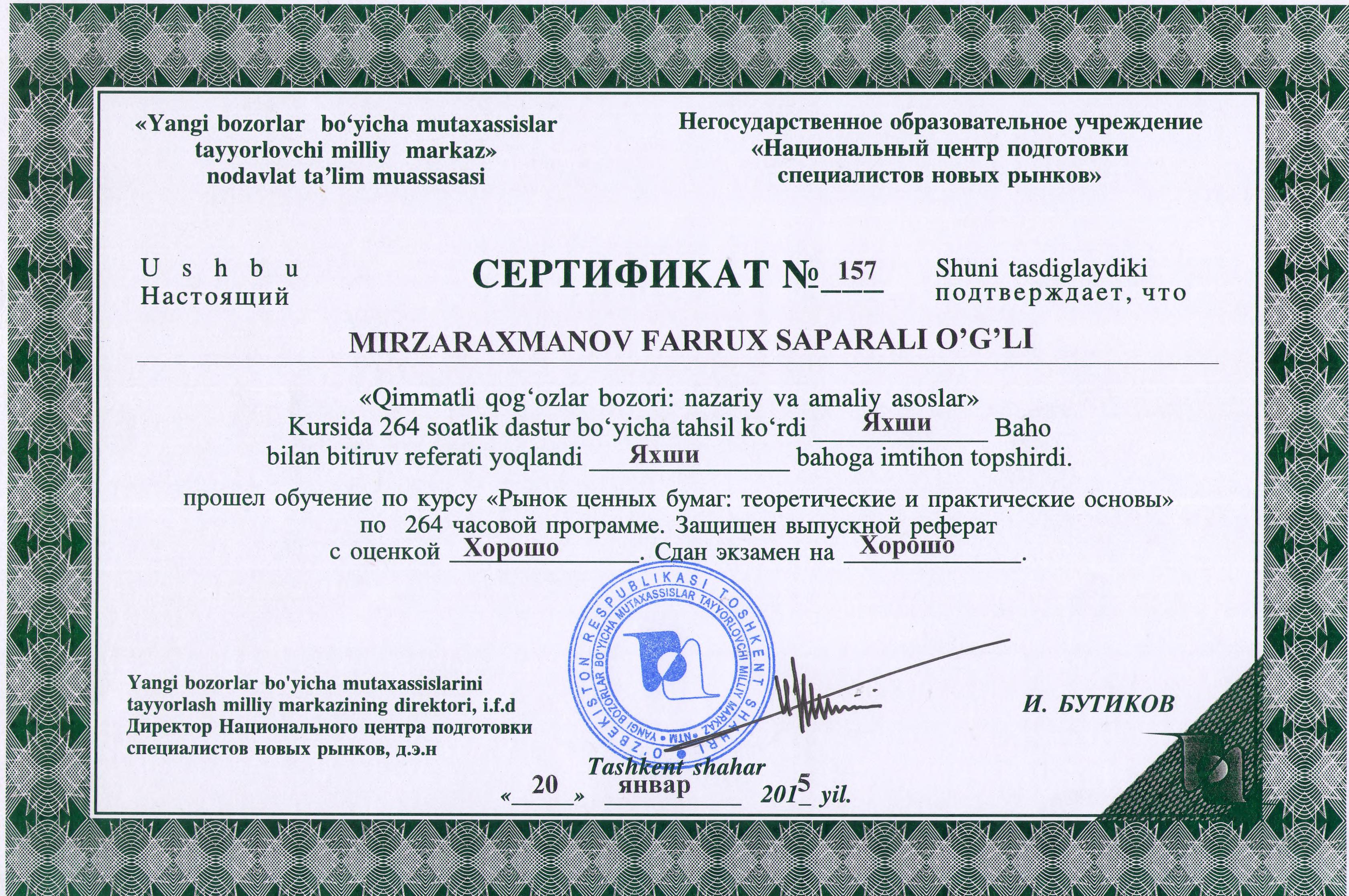 Подготовить слушателей к прохождению аттестации в уполномоченном государственном органе по регулированию рынка ценных бумаг Республики Узбекистан и получению аттестата специалиста ценных бумаг II и I категорий.