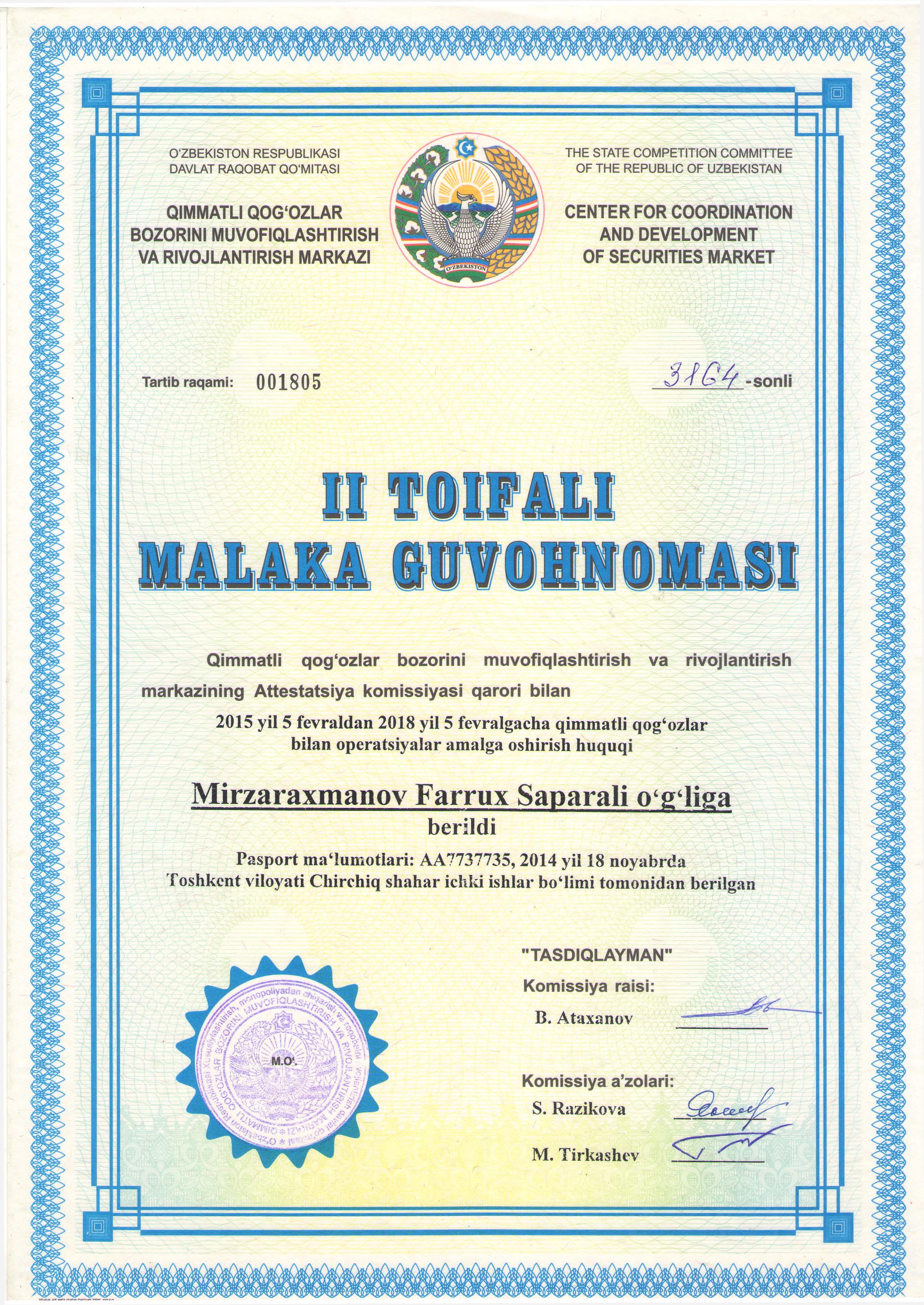 - Закиров З.Ф., основатель ПИФа «Туркистон-инвест», экс-руководитель ИРЦ РЦБ